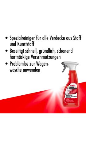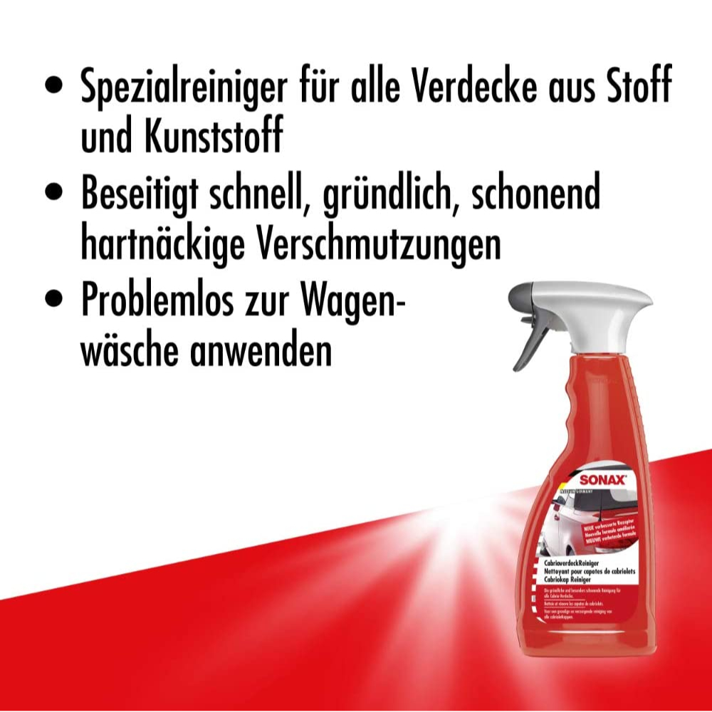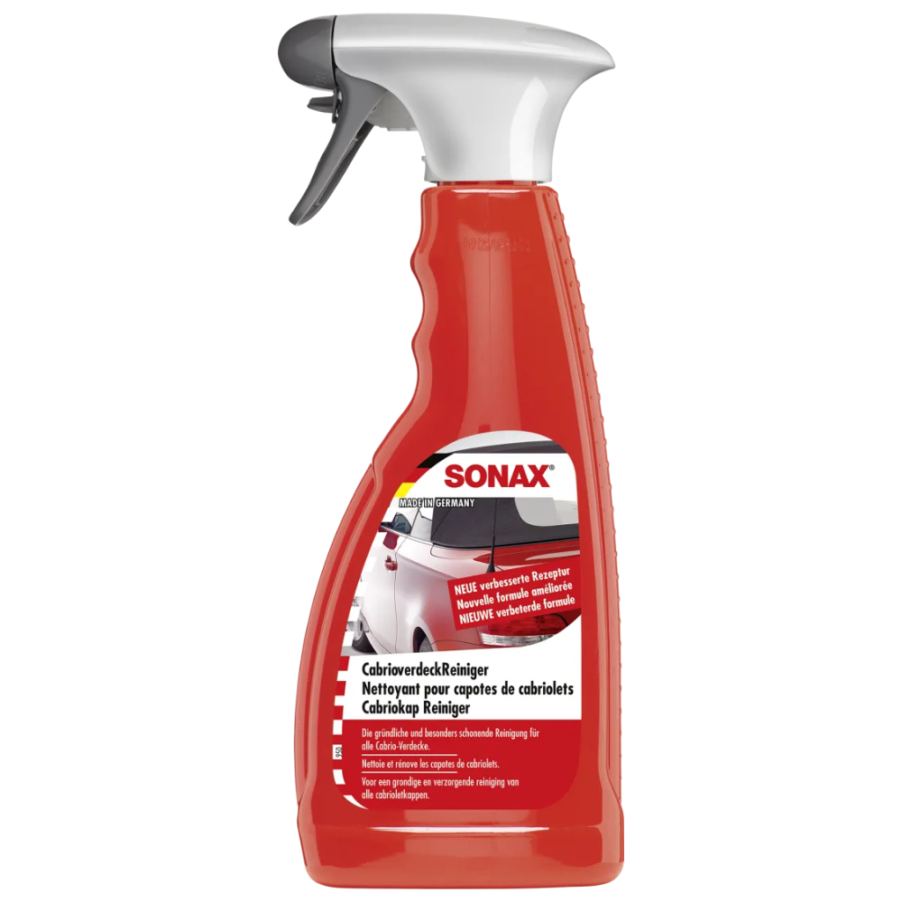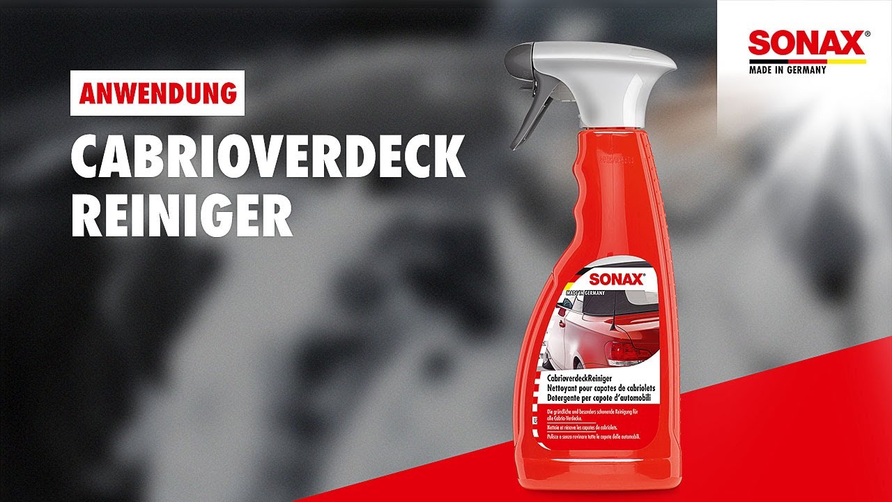 Специальный очиститель SONAX Cabrioverdeck Reiniger 309200 500 мл для всех складных верхов кабриолета из ткани и пластика. Быстро, тщательно и особенно бережно удаляет даже стойкие загрязнения. Легко применять при мойке автомобиля. Очиститель складного верха SONAX не повреждает оригинальное лакокрасочное покрытие.