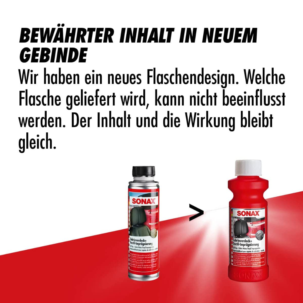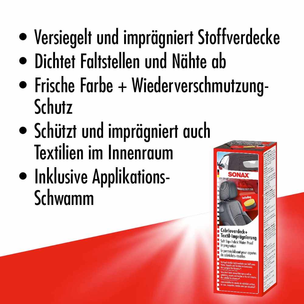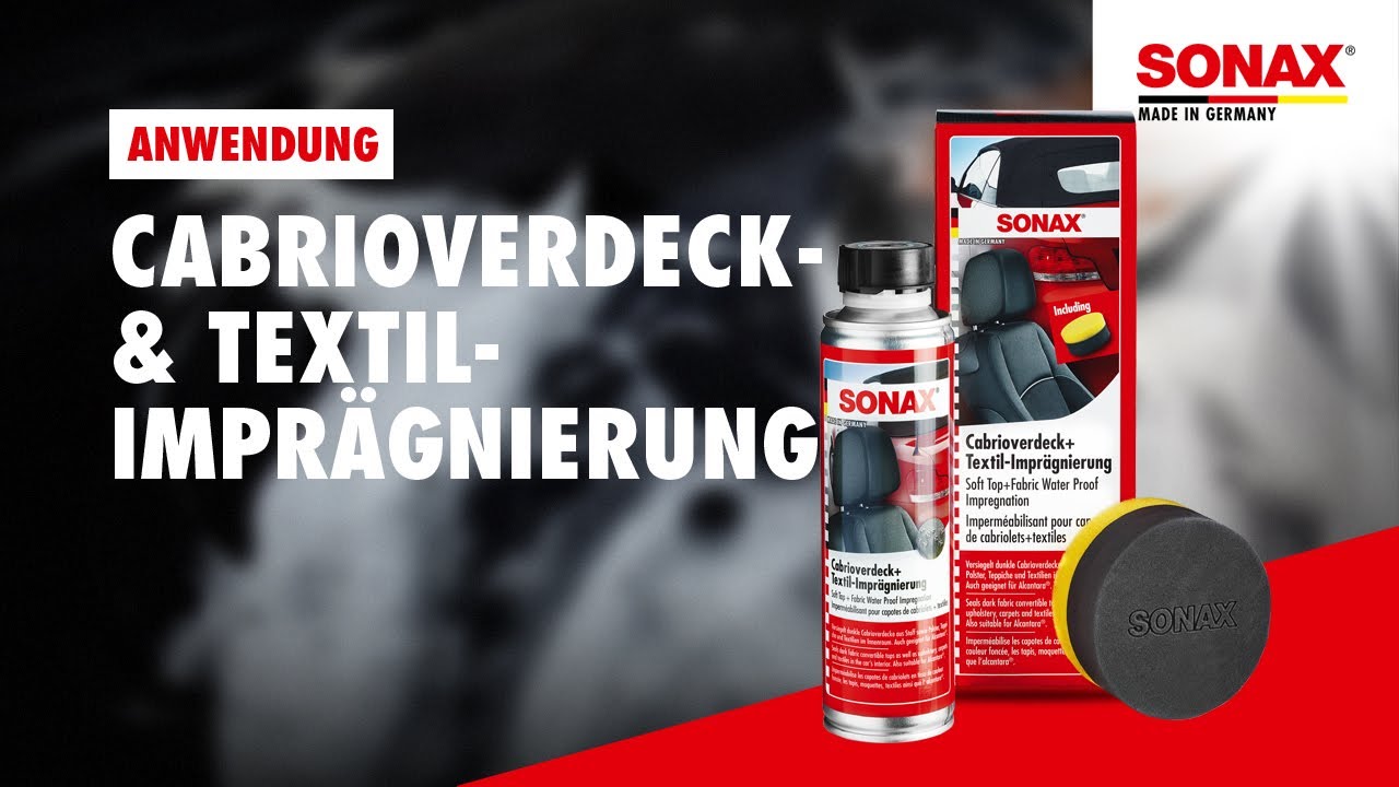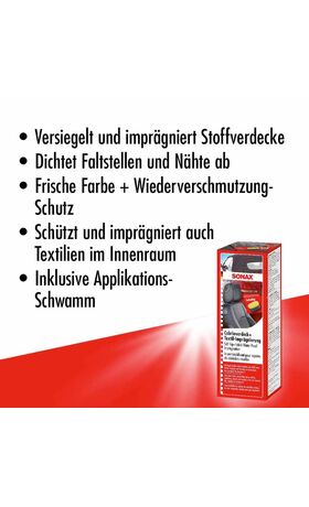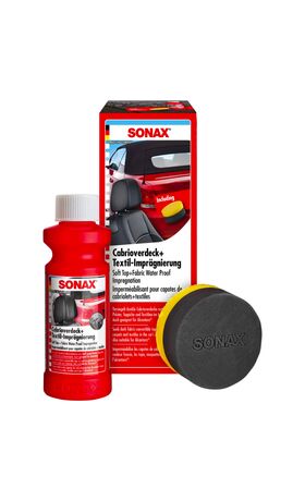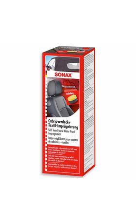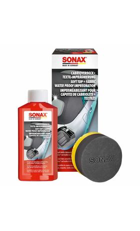 Герметизация и пропитка для кабриолетов из черной ткани от Сонакс. Прежде всего это средство, герметизирующее сильно напряженные складки и швы. Освежает цвет и защищает от повторного загрязнения. Также предотвращает промокание ткани и проникновение грязи и влаги в ткань и сиденье из алькантары, ковры и текстиль. Предохраняет ткань от пересыхания в жару и от перемерзания зимой. Комплект включает в себя специальную губку для чистого и равномерного нанесения.